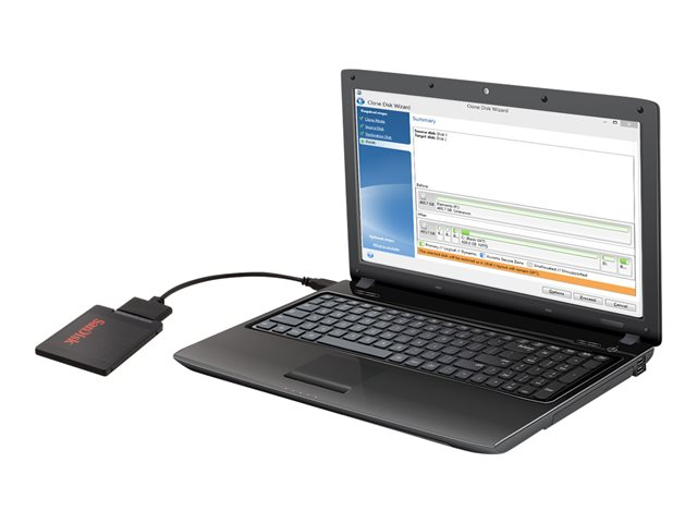 Vous souhaitez remplacer votre ancien disque dur par un disque SSD ultra-rapide ? Le kit de mise à niveau d'ordinateur portable avec un disque SSD SanDisk comprend un logiciel de clonage pour répliquer vos données, vos applications et votre système d'exploitation, des instructions étape par étape et un câble de transfert rapide USB 3.0-SATA pour brancher votre disque . Lorsque vous serez prêt(e) à faire le changement, ce kit vous simplifiera la tâche.Les produits SanDisk sont élaborés selon les plus hauts critères de fabrication et rigoureusement testés. La qualité, les performances et la fiabilité remarquables des produits SanDisk vous sont ainsi assurées.