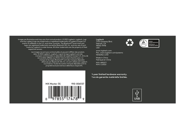 | Caractéristiques | Logitech Darkfield Laser Tracking, technologie Easy-Switch, fonction gestuelle, batterie rechargeable, repose-pouce, roue MagSpeed, DPI personnalisable, molette, technologie Quiet Clicks |