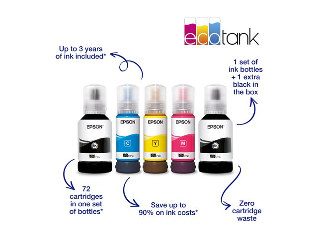 Économisez jusqu'à 90 % sur vos coûts d'impression avec les imprimantes et multifonctions EcoTank sans cartouche d'Epson. Fourni avec des bouteilles d'encre haute capacité, ses réservoirs d'encre intégrés sont faciles à remplir grâce aux bouteilles d'encre spécialement conçues. Sans aucune cartouche à remplacer et doté de fonctionnalités de connectivité flexibles ainsi que de l'impression Recto Verso, ce multifonction est idéal pour les personnes qui recherchent des impressions de haute qualité et un coût par page incroyablement bas.
