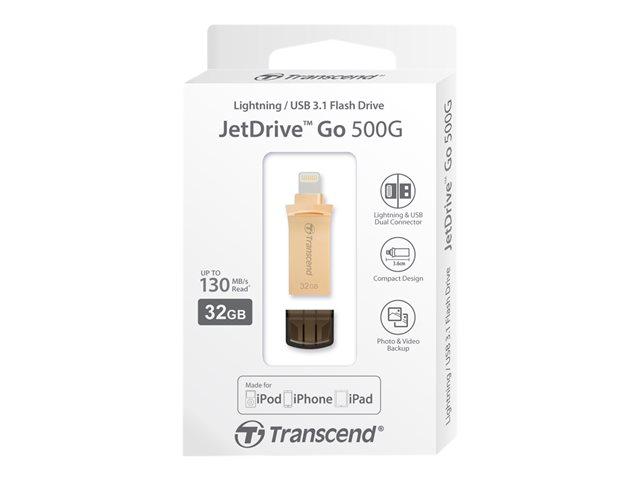 Spécialement conçue pour iPhone, iPad et iPod, la clé Transcend JetDrive Go 500 Lightning/USB 3.1 vous offre une capacité de stockage supplémentaire, le tout dans une coque raffinée en alliage de zinc. Et grâce à l'application exclusive JetDrive Go App, vous pourrez profiter de fonctions étonnantes!
