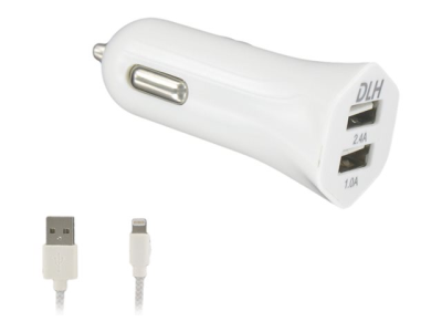 DLH DY-AU2571WMFI - Adaptateur d'alimentation pour voiture - 12 Watt - 2.4 A - 2 connecteurs de sortie (USB) - sur le câble : Lightning - blanc