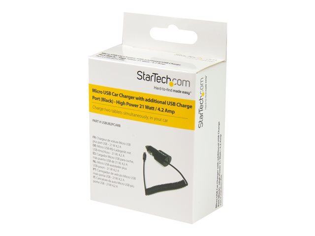 Le chargeur de voiture durable et noir à deux ports USBUB2PCARB bénéficie de la garantie de 2 ans de StarTech.com pour une performance fiable.