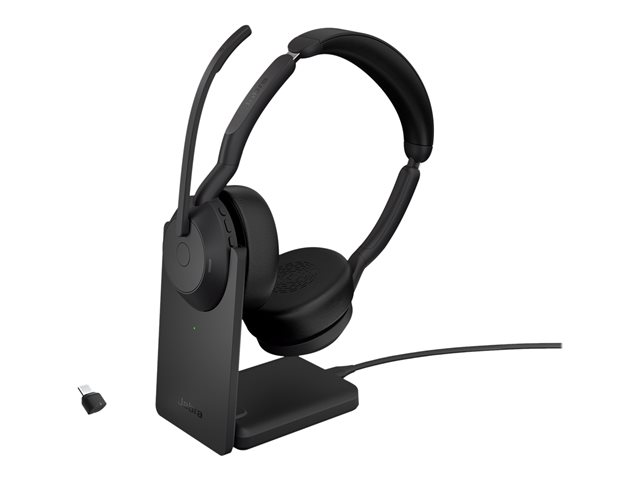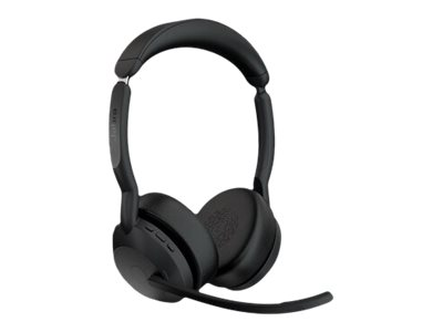 Jabra Evolve2 55 UC Stereo - Micro-casque - sur-oreille - Bluetooth - sans fil - Suppresseur de bruit actif - USB-C - noir - avec support de chargement - certifié Zoom, Cisco Webex Certified, Optimisé pour Microsoft Teams, Certifié Alcatel-Lucent, Certifié Avaya, Certifié Unify, Certifié MFi, Certifié Amazon Chime